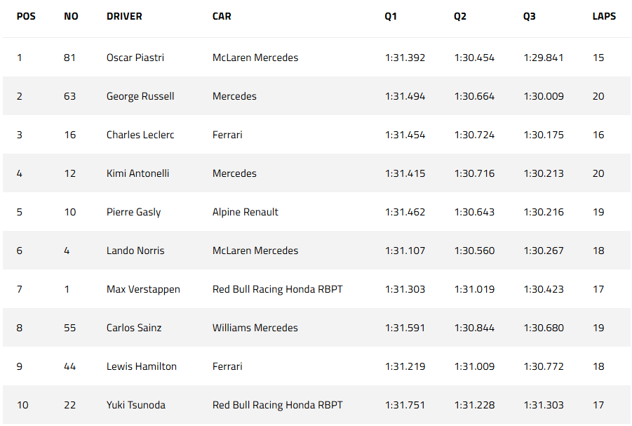 Charles Leclerc stamps his authority best he can and settles himself in P2 at the end of the session, soon to be displaced by George Russell in the Mercedes, who takes P2 for himself, nearly 2 tenths down on Australian Oscar Piastri, who has been excellent all weekend so far. But what for George’s Mercedes Teammate? The young Italian has just placed himself 4th for the Grand Prix tomorrow, which also beats his career best of 6th, which was set last time out in Japan. Fifth goes the way of Pierre Gasly, in a surprising result for both himself and the Enstone team. Way down in 6th is where we find title-hopeful Lando Norris, some 4-and-a-half tenths down on his teammate. 7th is a disgruntled Max Verstappen. The Dutchman clearly unhappy with his RB21 car, a polar opposite to the elation he felt a week ago in Japan. Behind Max, comes the Williams of Carlos Sainz in a season-best of 8th place, 7 places higher than ‘robbed’ teammate Alexander Albon. 9th and 8 tenths off his Ferrari teammate Charles Leclerc is 3-time pole-sitter in Sakhir, Lewis Hamilton. And lining up 10th comes Yuki Tsunoda, who seems to be gelling better with the RB21 this weekend.